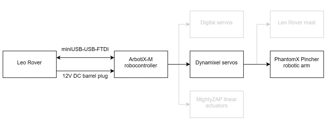 You'll follow the official instructions from Trossen Robotics' website to assemble the arm with only few exceptions that are specific to Leo Rover mounting interface.