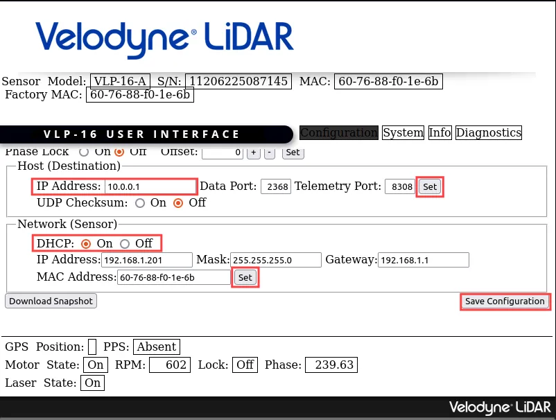 Address to 10.0.0.1 and click Set. In Network (Sensor) section change