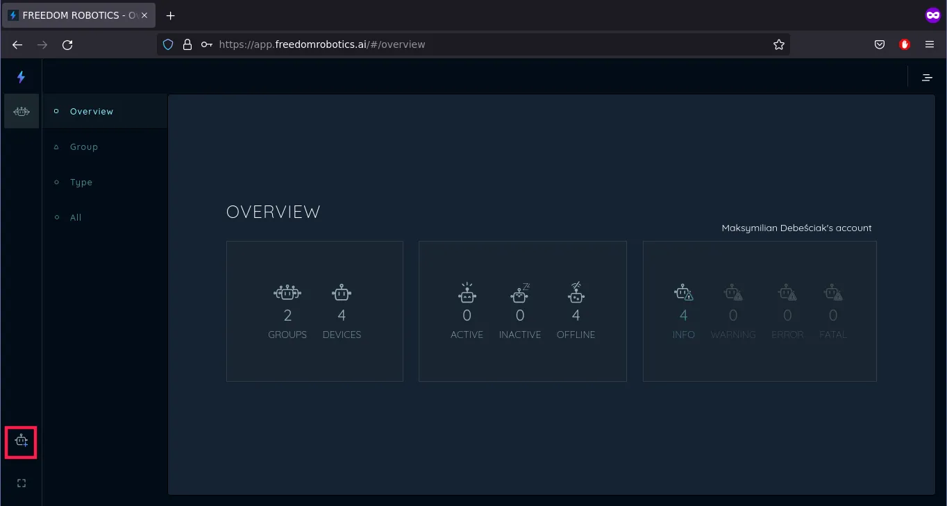 After logging in, you should see the main menu with an overview of your robots.