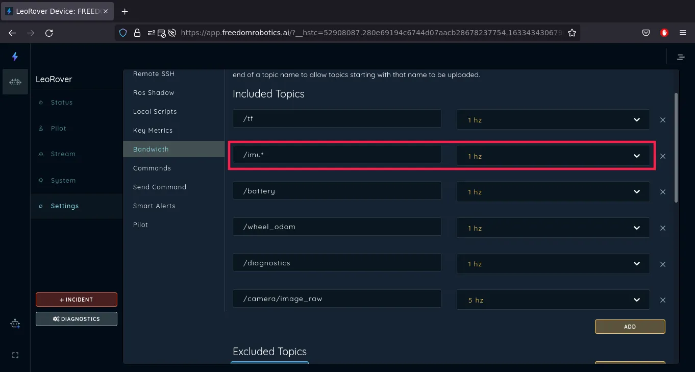 Now, connect to your device via Freedom Robotics and go to the device Settings and then go to the Bandwidth section.